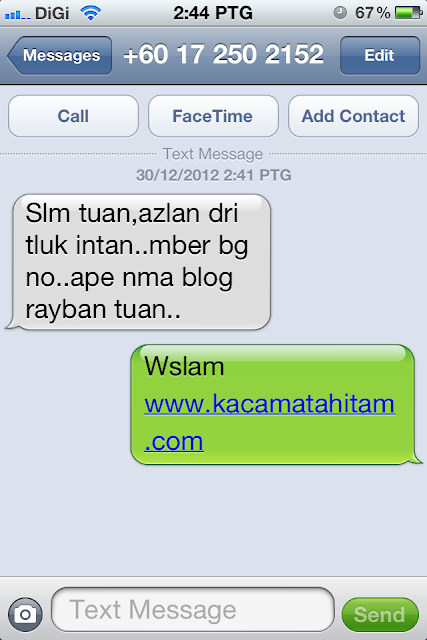 Ok itu sahaja dapat dikongsikan dengan pembaca sekalian. Anda juga boleh kongsikan azam tahun baru anda kepada email saya. Teringin juga saya nak baca....ok Assalamulaikum semua dan selamat menyambut tahun baru 2013 buat kaki Ray ban dan Oakley Malaysia semua...=)